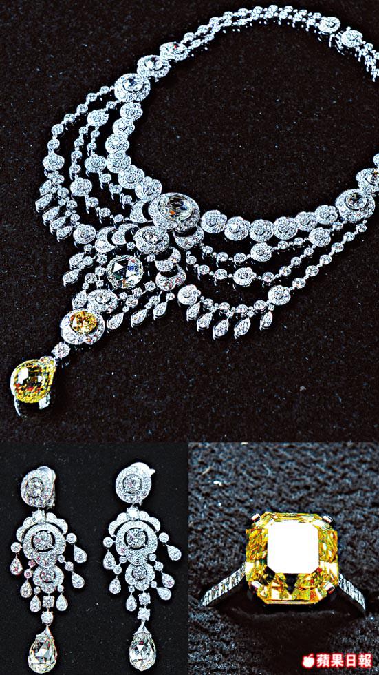 恍如胸飾的弧線垂吊頸鏈,主要採用切割面較少、折射度較低的舊式RoseCut鑽石呈現復古味道。正中央由兩顆重逾12卡的鑽石作引子,最末垂吊的主石是一顆水滴形黃色鑽石,重量達50.03卡,價值超過6,400萬元,氣派不凡。