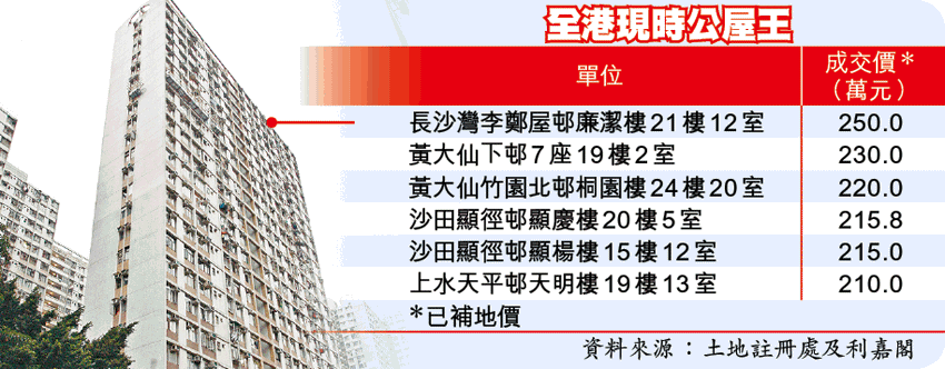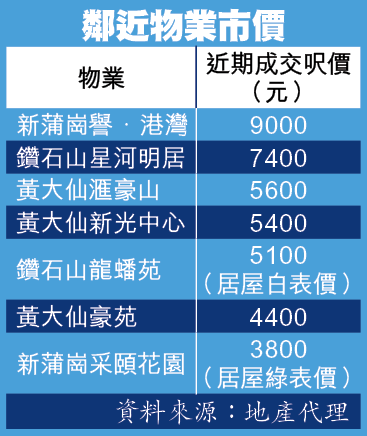 【本報訊】黃大仙新盤現崇山揚言高開,意向呎價高達1.2萬元,同區二手業主十級亢奮,懶理樓市不利消息湧現,紛紛反價封盤,公屋更爆出超級癲價成交。鑽石山鳳德邨一個691方呎單位,綠表成交價高達190萬元,稱冠全港,代理表示,單位若在自由市場連地價轉售,售價隨時高達350萬元,打破全港最貴公屋紀錄。