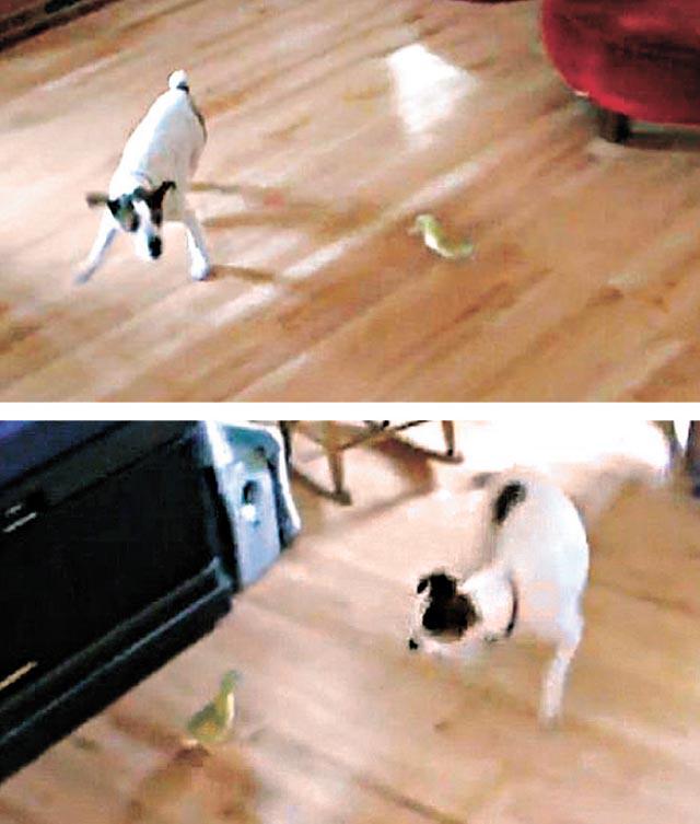 網上流傳這段搞笑短片(圖),一隻積羅素爹利犬,在屋內與小鴨子狹路相逢。一身黃毛的小鴨子,外表纖弱嬌小,但聲音很尖不斷嘎嘎叫。牠一點也不怕眼前的龐然大狗,急步向着牠跑過去。狗狗看着這身手矯捷的小東西,反而顯得很害怕,狂吠亂汪。