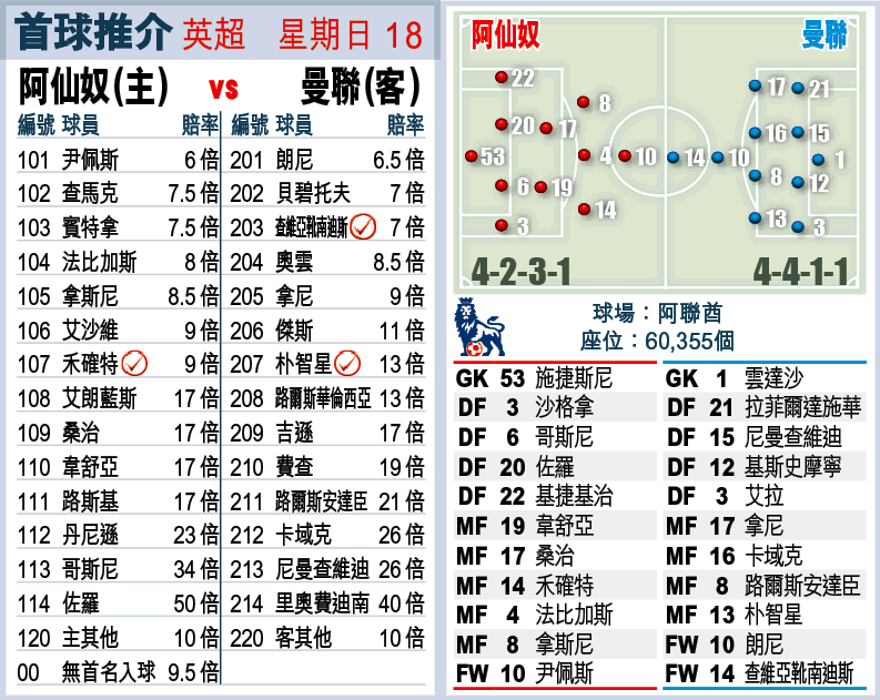最後說盤口。兵工廠近8場輸足7口盤,「讓球」更全輸;而曼聯今季英超作客只曾一次開出平手盤,是客征曼城,賽果是0:0,博好分,就博和。