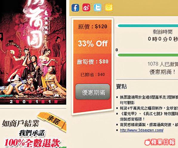 標榜全球首部立體色情片《3D肉蒲團之極樂寶鑑》雖然口碑麻麻,但由於內地禁映,令內地客對其趨之若鶩。因本港戲院的網上預訂戲票服務,很多只接受本地發出的信用卡過數,為內地團購網站帶來商機,網站購入不同場次的大量戲票後,再以80元人民幣一張(本港一般正價80港元)供內地網民選購。
