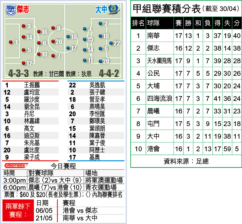 南華暫以兩分之差壓住傑志居聯賽榜首(見附表),但只要傑志此戰擊敗尾2且已篤定降班的大中便可重登榜首,而周五作客再在港會身上全取3分,便可以繼63/64球季後,相隔近半個世紀後再次捧走代表港甲最高榮譽的聯賽冠軍獎盃,這無疑是慶祝球會80周年會慶的最佳賀禮。