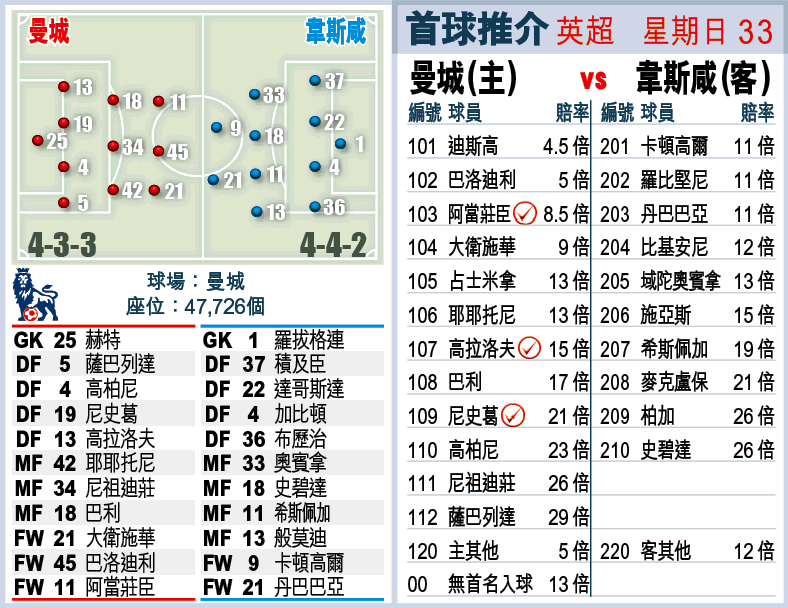 同日曼城主場對韋斯咸(球賽編號:星期日33;有線201、202、301、302台今日11:10pm直播),恐怕又是戰況懸殊的球賽,很多說曼城已放眼月尾的英足盃決賽,但力保前4亦極為重要,今仗3分志在必得。