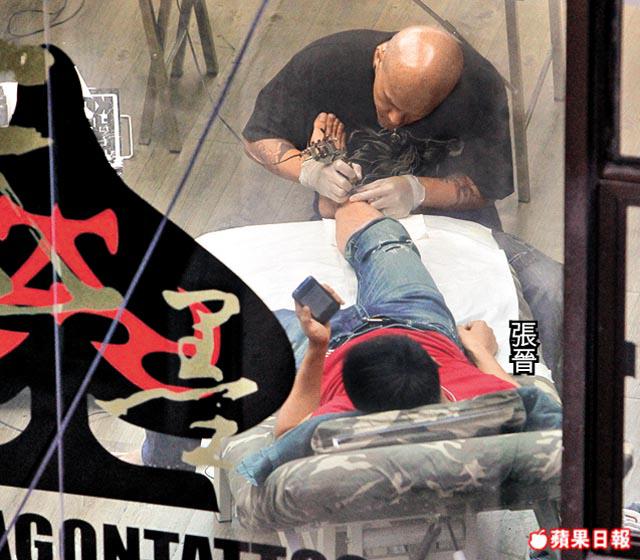 就記者所見,張晉躺在床上,讓Gabe在右腳眼位置紋上圖案,在Gabe紋身期間,張晉不停拿手機拍照及上微博,蔡少芬則坐在一旁耐心等候。