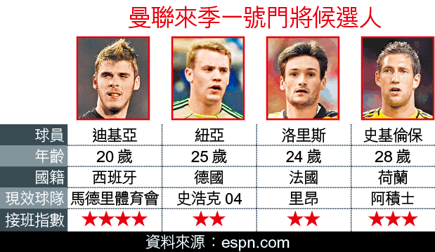 原本以史浩克04門將紐亞在歐聯準決賽首回合,連番勇救曼聯攻門的突出表現,理應更增添費Sir印象分,可惜紐亞決意留在德國,盛傳已跟拜仁慕尼黑達成協議。其實「以荷換荷」,由史基倫保接任雲達沙的位置,也是不錯選擇,特別在南非世界盃後,出任荷蘭國家隊一號門將的他,甚為穩固,而且經驗亦遠比迪基亞豐富;可惜此子今季飽受傷患困擾,大幅跌watt,成為紅魔中人呼聲亦越來越低。文:牽牛