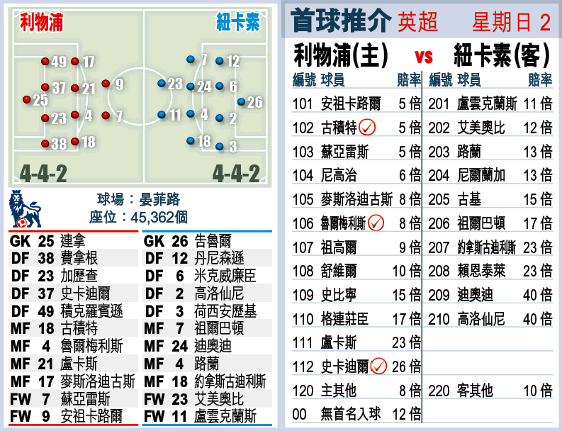 周日利物浦迎紐卡素時,焦點一定是於季中轉會紅軍的前鋒安祖卡路爾,能否趕及傷癒披甲。雖然,最新消息是這名英格蘭中鋒要通過最後體測才可以上陣,但紅軍人材濟濟,前鋒古積特與中場麥斯洛迪古斯腳風又順,配合質高的主力如蘇亞雷斯等,就算續缺中場謝拉特、後衞丹尼爾艾格及格連莊臣等主力,紅軍今役贏面仍高。