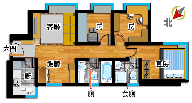 細碼三房單位690餘至730餘方呎,擁有較工整的日字廳,客飯廳分區清晰,惟獨4、5座約900方呎E至H室大碼三房戶,則屬鑽石廳。