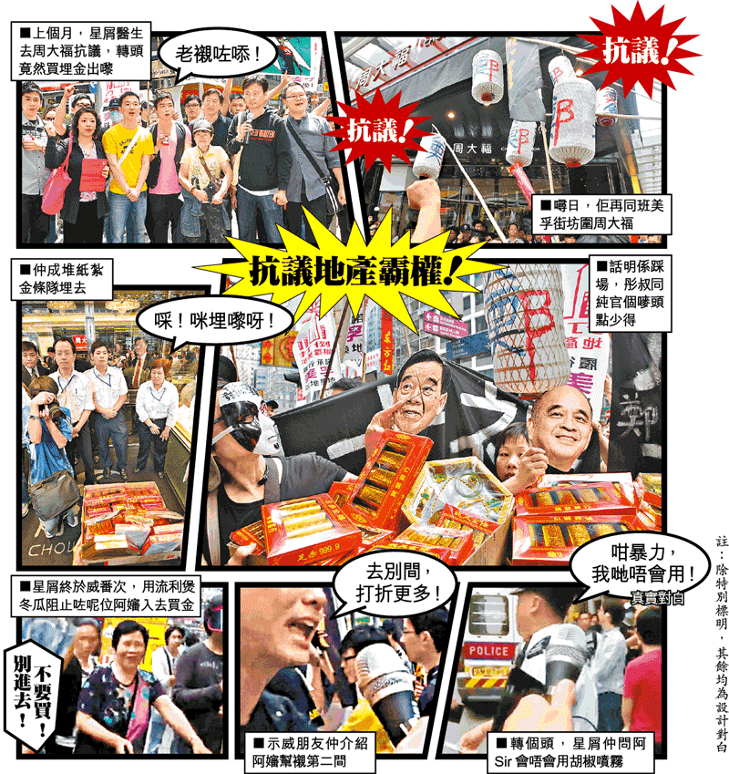 噚日成百人穿梭喺彌敦道兩邊,連環封鎖五間周大福金行,反地產霸權。喺魔鬼喇叭刺耳效果助興下,請願人士帶齊晒紙紮祭品,要送畀新世界集團主席鄭裕彤兩仔爺,結果又要出動保安同警員封鎖入口,生意就梗係做唔成啦。