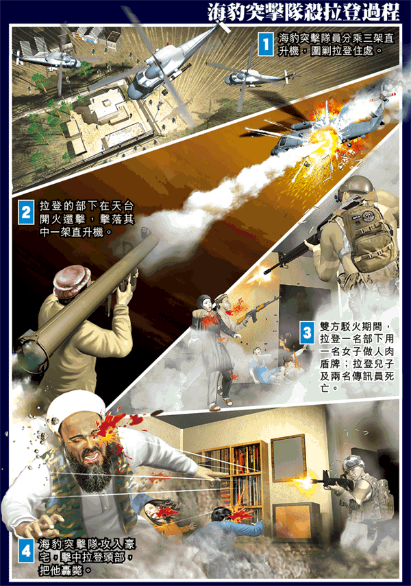 在巴基斯坦時間昨日凌晨1時(本港時間昨日凌晨3時),海豹突擊隊24人,在中情局長帕內塔(LeonPanetta)指揮下,摸黑展開「手術式突襲」行動。