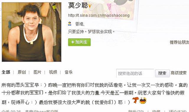 莫少聰噚日一早再上微博留言冧粉絲,佢話:「昨晚一直把所有你們對我說的話看完。讓我一次又一次的感動。真的十分感謝我的寶寶們。是你們給了我很大的力量,最後我要很大很大聲的說:『我愛你們耶。』」粉絲睇完肯定心甜啦!