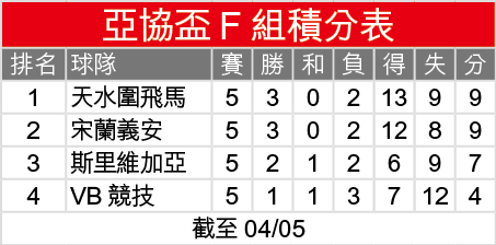 宋軍全取3分後與飛馬同得9分,猶幸後者仍憑較佳得失球差續居小組榜首,餘下一仗作客昨日以0:2不敵VB競技的印尼球隊斯里維加亞,只要保住不敗仍能躋身16強。