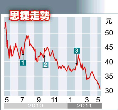 分析員JoshuaLu看好思捷,原因有三:一、歐洲經濟復蘇,有助定單回升;二、拓展中國市場,添內需概念;三、股價低殘,估值吸引。但歐債危機陰霾不散,通脹高企而增長低迷,經濟好轉言之尚早,進軍內地亦只聞樓梯響,令股價低處未算低,周一收報30.3元,直逼海嘯價!