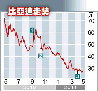 去年股神畢菲特參觀比亞迪(1211)車廠帶來憧憬,大摩將評級由與大市同步升至增持,目標價66元,預言「第三季見底,並將出現V形反彈」,癡戀的噩夢由此開始。