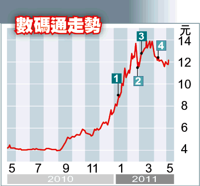 iPhone概念令數碼通(315)過去1年爆升2.6倍,iPhone4月費動輒300元以上,帶動ARPU(每月每戶平均收入)大增,去年下半年勁賺3.2億元,按年升1.9倍。數碼通狂炒,但瑞信分析員ChateBenchavitvilai堅持股價只值7.8元,評級為跑輸大市,結果錯失大段升浪。該股3月高見14.38元,周一收報12.2元。