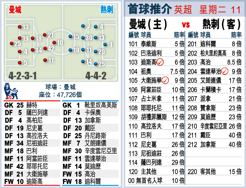 第4位的曼城在周二英超聯獨腳戲,迎第5位熱刺時若勝出,下屆就能首次參加歐聯,由於熱刺要保住些微的歐聯機會,曼城又有英足盃決賽後顧,「讓球主客和」曼城[-1],博熱刺「客勝」兼補入球「大」。(球賽編號:星期二11;有線301及201台明日2:45am直播)吾中