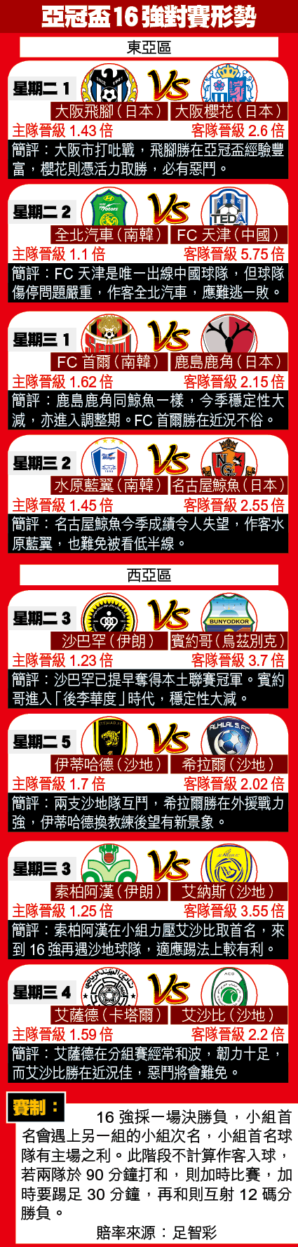 亞冠盃16強今日開打,較早開賽的有東亞區賽事,其中兩支日聯球隊飛腳及櫻花將會對壘,更上演「大阪打吡戰」。縱然櫻花要作客比賽,但同市出戰應沒有太大問題,博他們可於法定時間內不敗,取[+1]的「客勝」。(球賽編號:星期二1;now671台今日6:00pm直播)