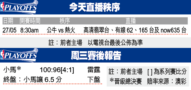 小馬功臣還有38歲控衞傑特、「第6人」泰利及後衞巴里亞,在第4節攻入全場26分中的15分的前鋒馬利安亦為獲勝功臣,首次打總決賽的他賽後說:「我們今仗沒有放棄,繼續保持獲勝信念。」且看小馬在總決賽能否保持強勢,打破球隊總冠軍荒!