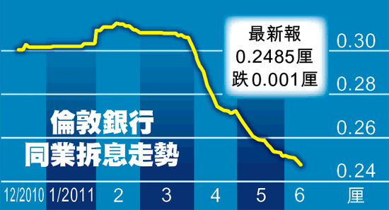 LIBOR昨跌至0.2485厘的歷史新低,有分析指,金融市場對前景憂慮令商業借貸需求減少。LIBOR本是全球逾350億美元金融產品的指標息率。巴克萊資本貨幣市場策略師JosephAbate指,觀乎環球短期息口走勢,LIBOR跌至低過聯儲局超額存款準備金率0.25厘並不出奇,3個月LIBOR可能仍會續跌。