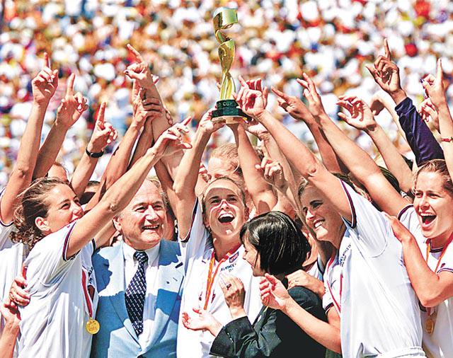 女子世界盃(FIFAWomen'sWorldCup)乃女足球壇最至高無上賽事,與男子世界盃一樣,4年一度舉行,獲國際足協認可。首屆女子世界盃在1991年於中國舉行,決賽由美國以2:1挫挪威而捧盃。美國雖然在男足上發展一般,但在女足尚發展蓬勃,並於99年再奪世盃(圖),與德國一樣成為奪得女子世界盃最多的國家(2次)。