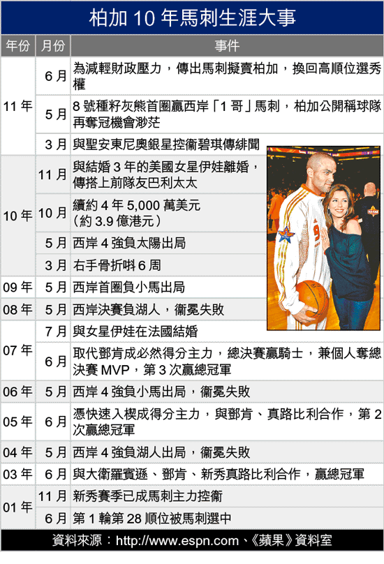 今年5月滿29歲的柏加,生涯10季均在馬刺度過,教練普波域治當年有擔心身高6呎2吋、體重180磅的柏加不夠強壯,但是他快速入楔及「Teardrop」上籃成為成名的必殺技;柏加與前鋒鄧肯及後衞真路比利拍檔,贏得03、05及07年總冠軍,個人更成為07年總決賽MVP,生涯達至巔峯。柏加愛情路本甚愜意,於07年7月7日「777」與女星「靚太」伊娃在法國結婚,人生本美滿。