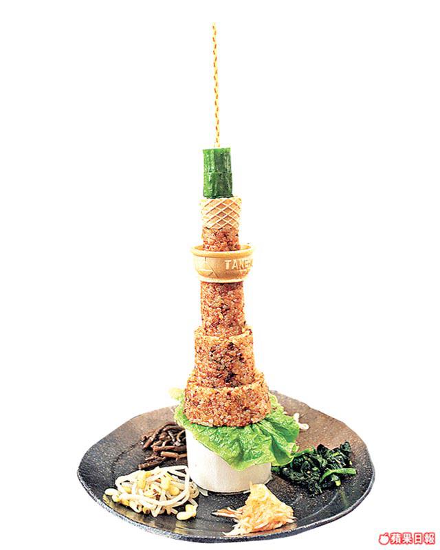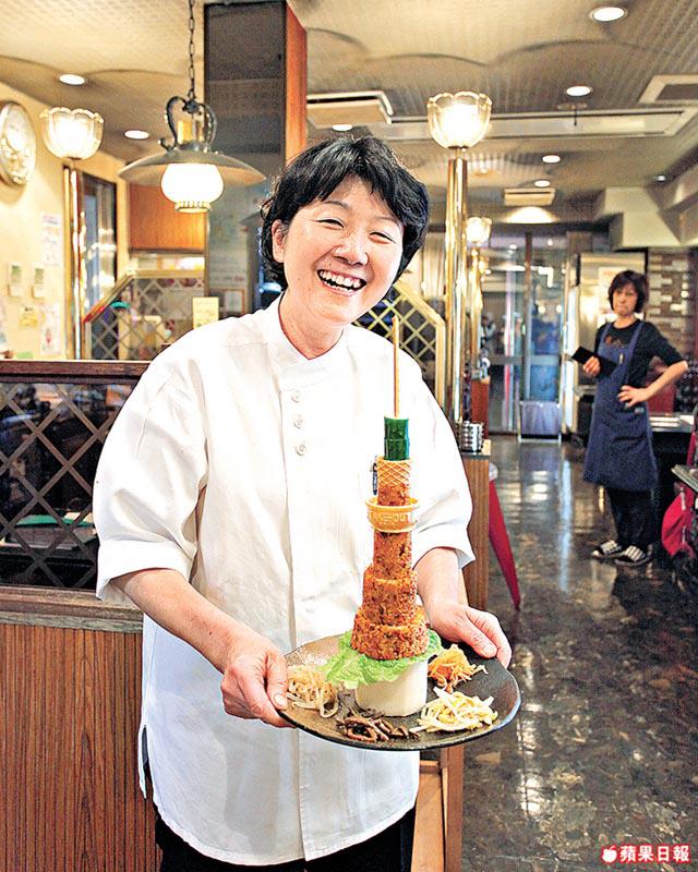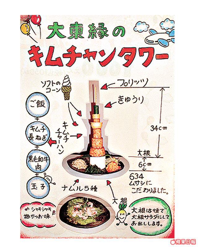 在墨田區位處2樓的烤肉店大東緣,開業達45年,位置隱蔽,因創出炒飯金塔,是以吸引很多遊客慕名前來。金塔以大蘿蔔墊底,再層層叠4個飯糰,以雪糕筒做出展望台,頂上再加青瓜及百力滋。表面看來飯糰硬實,其實內裏加入黑毛和牛碎粒、雞蛋及秘製醬料炒成,入口味濃香軟。吃罷後,老闆娘更將底部蘿蔔刨碎,拌以梅乾及蔬菜做出沙律,最後老闆更送上柚子啫喱做甜品,同樣是塔形,kawaii!