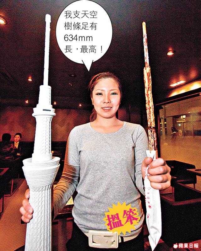 論高,位於下町巷內的CheckIn摘冠,推出的天空樹甜品,足有634mm高,以士多啤梨及朱古力味的西班牙炸條Churros做主材料,中間以數條粗朱古力條支撐住,可以說是一柱擎天,不過似乎不太穩陣,拍攝時店員一放手,即左搖右擺,還幾乎折斷!這支危危乎的西班牙炸條開價1,500日圓,每日限售20條,須早一日預訂。