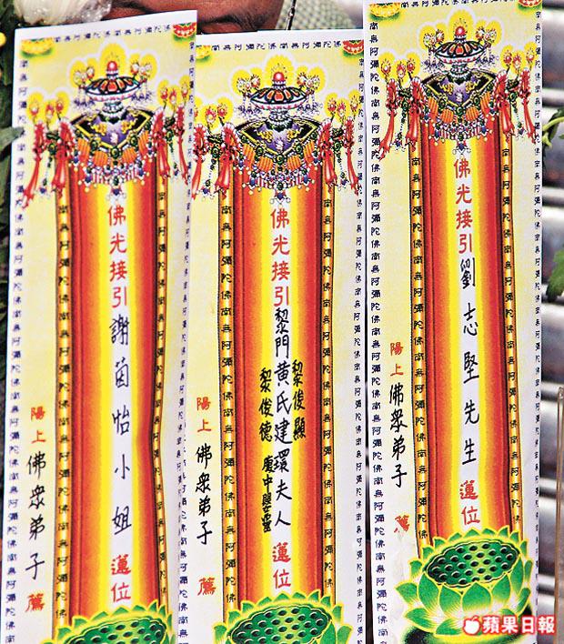 現場所見,佛教徒替大火中罹難的四名死者,包括18歲少女謝茵怡,36歲婦人黃建環,其6歲及1歲兒子黎俊顯及黎俊德,以及她腹中胎兒設置蓮位超渡,由於昨日亦是中環執勤墮天橋殉職警長劉志堅的頭七,佛教徒亦同時替劉設蓮位超渡。