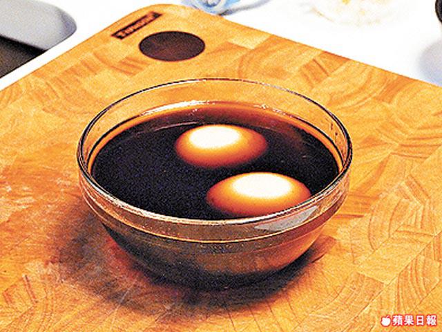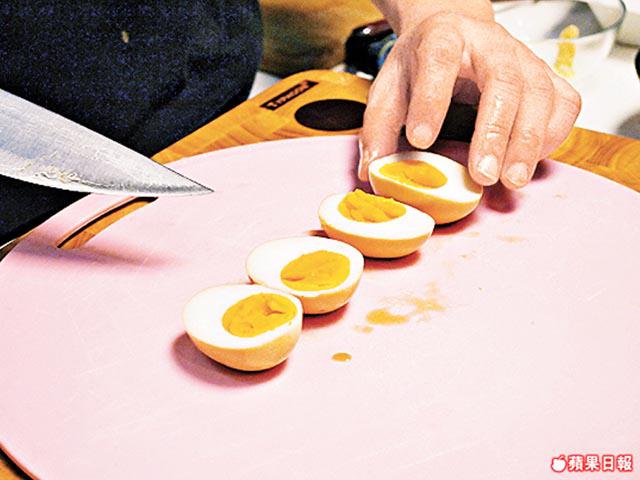 3.將蛋去殼,放入叉燒煮汁,用小碗加壓,放雪櫃浸至少1小時,或可浸過夜更入味;將雞蛋一開二。