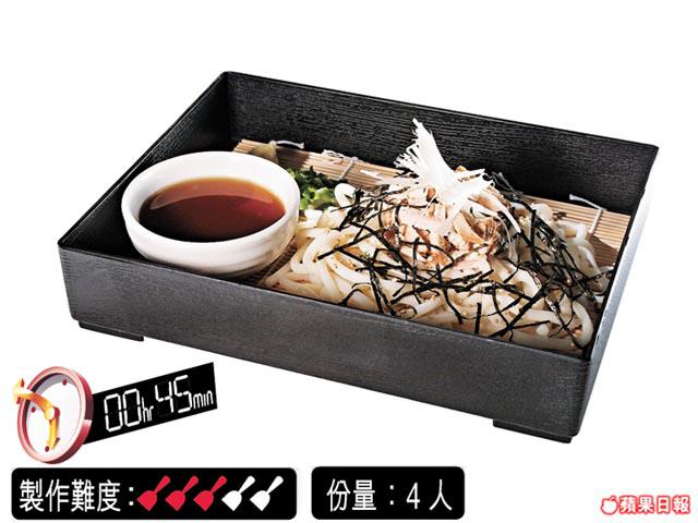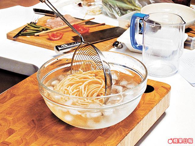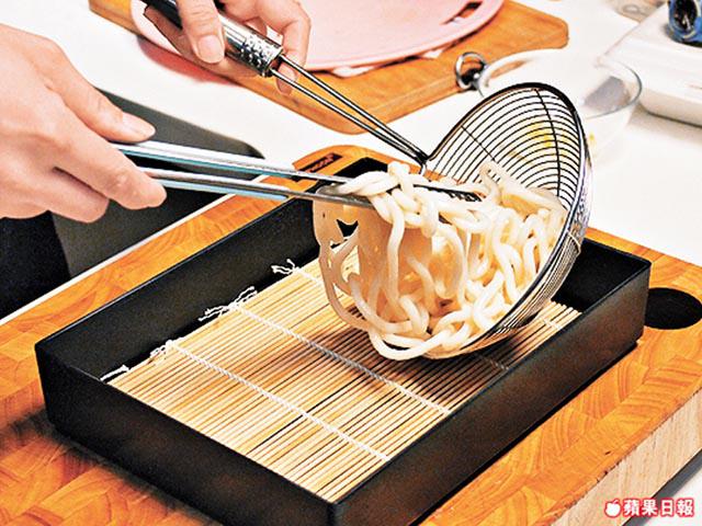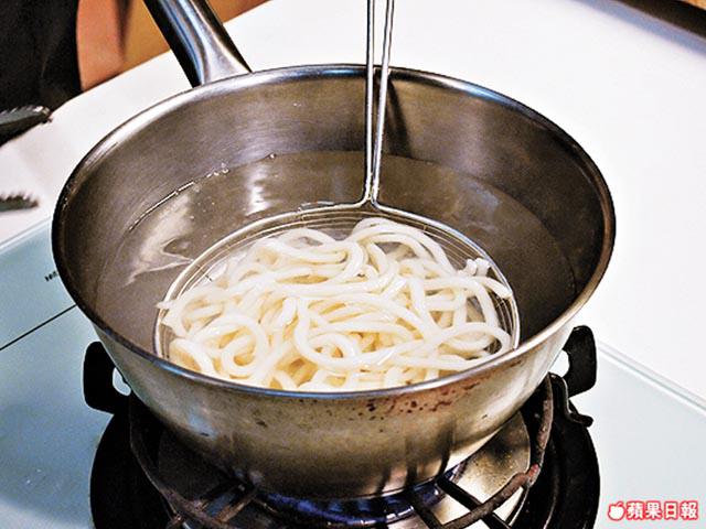 2.烏冬放滾水中煮散,盛起馬上放冰水冷卻,令麪身更煙韌,盛起先上碟。
