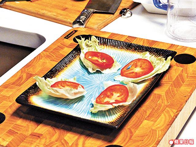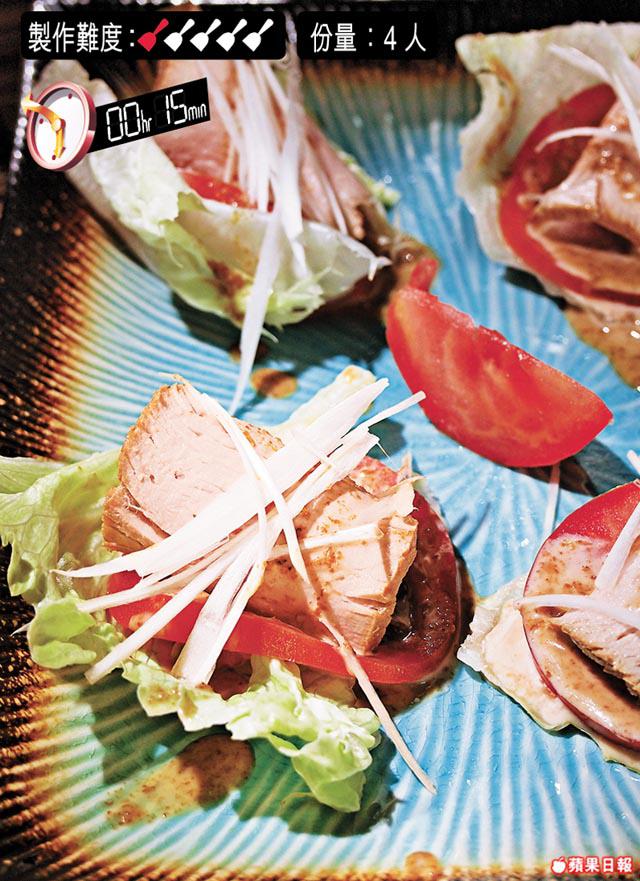 日式叉燒200克、番茄8片、日式胡麻沙律醬適量、西生菜8片、大葱絲適量