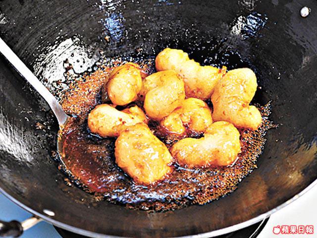 煮桂花糖膠時推至起泡即代表糖已起膠,這時要熄火下蝦球,否則很快會燶。