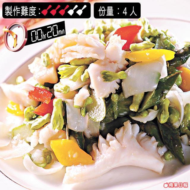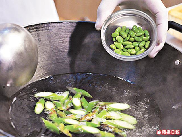 2.煲滾水,下半茶匙鹽、半茶匙糖、半茶匙雞粉及少許油,將蘆笋、毛豆烚1分鐘後,加入紅椒、黃椒、百合汆水,盛起瀝水。