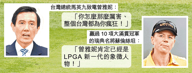 北愛爾蘭球手麥艾萊在男子高爾夫球界,剛以歷來最低桿數贏得美國公開賽冠軍,他與曾雅妮恰巧亦為22歲,故此兩人分別已成為了男女子高球界的領導人物。