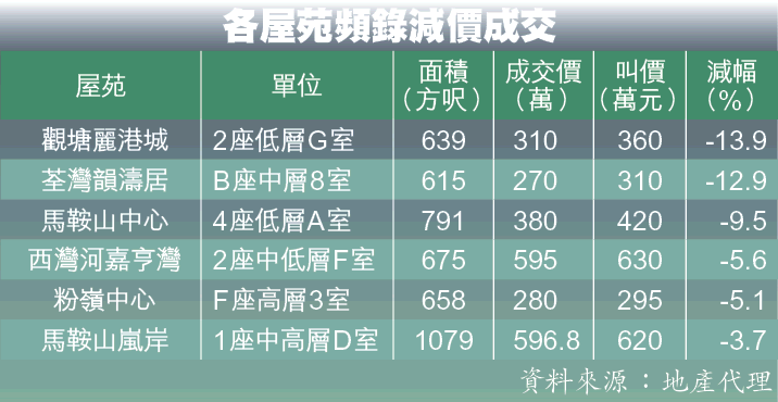 美聯物業營業經理伍民亮表示,馬鞍山昨日連錄至少兩宗減價成交,馬鞍山中心4座低層A室,791方呎,兩度減價近一成至380萬元售出,呎價4804元,屬近期低價成交。美聯物業助理營業董事邱鵬表示,西灣河嘉亨灣2座中低層F室,675方呎,亦減價35萬元至595萬元成交,呎價8815元。