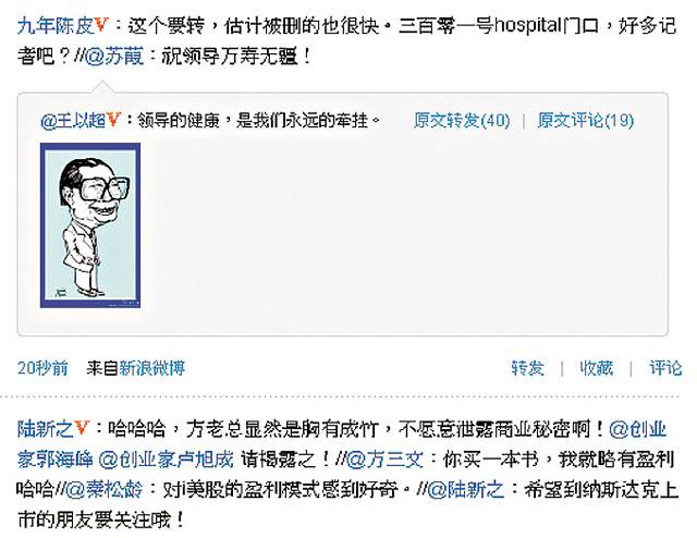 近日,微博上很多網民或名人都關切江的健康問題,其中財新網主編王以超在微博上貼上江的漫畫頭像,稱永遠牽掛領導健康,但留言已經被刪除。博訊網/新浪微博