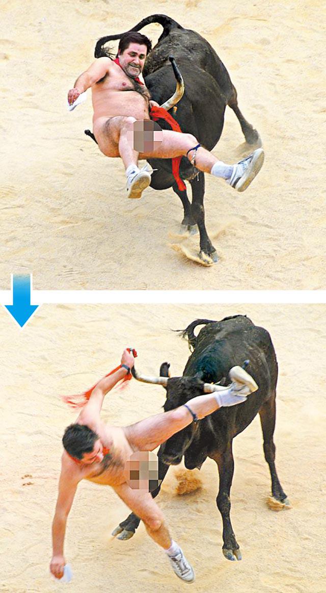 這名裸男前日(周日)聯同數千人和多隻蠻牛,由街頭狂奔往鬥牛場。開頭還好,後來未知是否力氣不繼,還是裸體太誘惑,一隻蠻牛竟追着他,將他撞倒,幸好蠻牛尖角沒刺中他那話兒,否則無陰功。他只是面部瘀傷,但仍有麻煩,原來他裸體奔牛構成「公眾滋擾」,被警方拘捕。