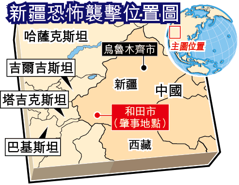 中共隆重慶祝西藏解放60周年、國家副主席習近平親赴拉薩之際,毗鄰的新疆和田市昨發生恐怖襲擊,被指手持砍刀、斧頭、手榴彈等兇器的維族人攻佔市內一個派出所,脅持人質並縱火。當局派武警包圍救人,雙方駁火,至少19死,多人受傷。其中15名維人遭擊斃,兩名人質遇難,一名武警和一名聯防隊員死亡。這是繼2009年烏魯木齊7.5事件後,新疆再發生重大死傷的暴力事件。
