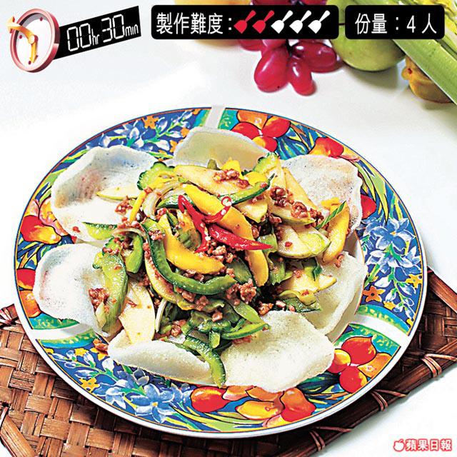 蒜茸1茶匙、肉碎200克、皇帝芒1個、青蘋果1/2個、苦瓜(切條)100克、青椒(切條)/洋葱(切絲)各50克、西芹(切片)80克、蝦片10片