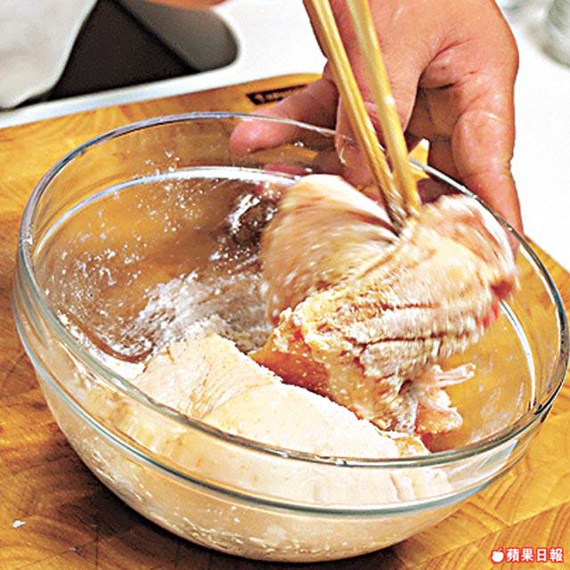 1. 雞扒下調味料拌勻,醃約20分鐘。