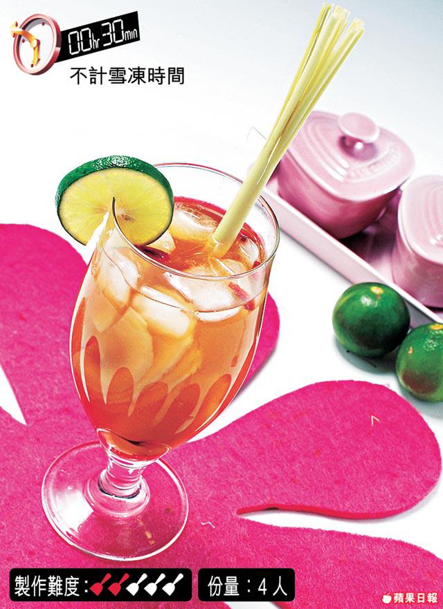 5. 倒出杞子香茅水,放雪櫃雪凍後倒入杯中,放上香茅及青檸片裝飾即成。
