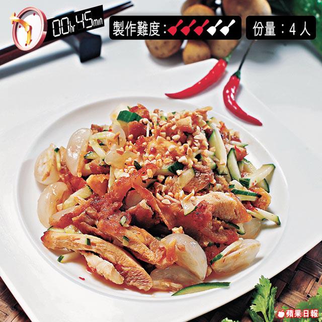 4. 將糖、豆瓣醬、蒜茸、醋、魚露拌勻,加入青瓜絲、蘆菇、雞條撈勻上碟,最後撒上花生碎即成。