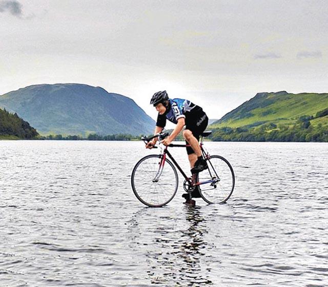 英國人氣魔術師Dynamo早前在倫敦泰晤士河「輕功水上飄」,令人嘆為觀止,坎伯里亞16歲少年懷特赫斯特(MattWhitehurst)不讓他專美,示範在水深近23米的巴特米爾湖面上踩單車(圖),圍觀者都嘖嘖稱奇。懷特赫斯特正為受前年當地水災影響的災民籌款,示範在水面上踩單車的絕技,但他拒絕透露箇中竅妙,「我不會透露如何做得到,但很多人都看見我這樣做,他們會證實這不是騙人把戲」。有人揣測湖面下可能有小船或漂浮裝置承托着單車。英國《每日郵報》