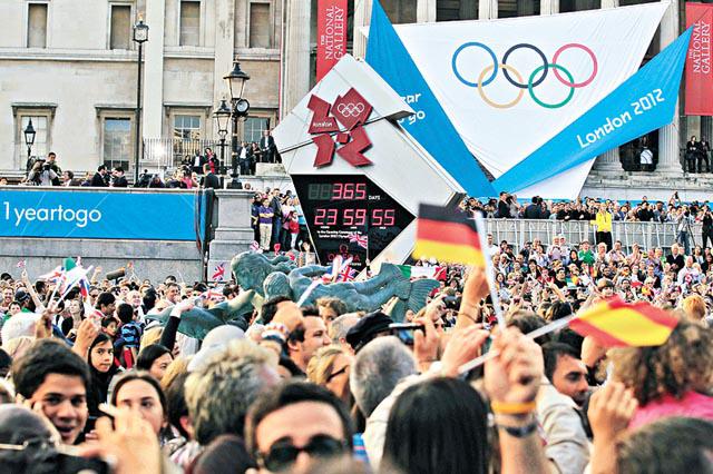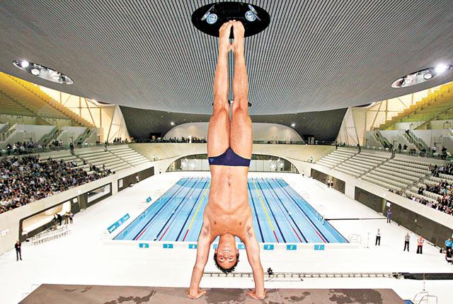 2012年倫敦奧運周三踏入倒數一周年,支持者在倫敦為倒數大鐘啟動歡呼,爭金希望戴利(下圖)則在泳館內表演10米台跳水。奧運獎牌(左圖)亦發佈,今屆獎牌為歷屆「最重手」,重量約400克。美聯社