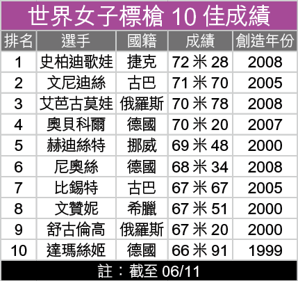 目前女子標槍世界紀錄保持者,為30歲的捷克運動員史柏迪歌娃(BarboraSpotakova),她於08年的世界田徑錦標賽總決賽中,以72米28成績奪標,並創下世界紀錄。事實上,史柏迪歌娃亦是08年京奧的冠軍人馬,當時亦以破歐洲最佳成績而勇奪金牌。