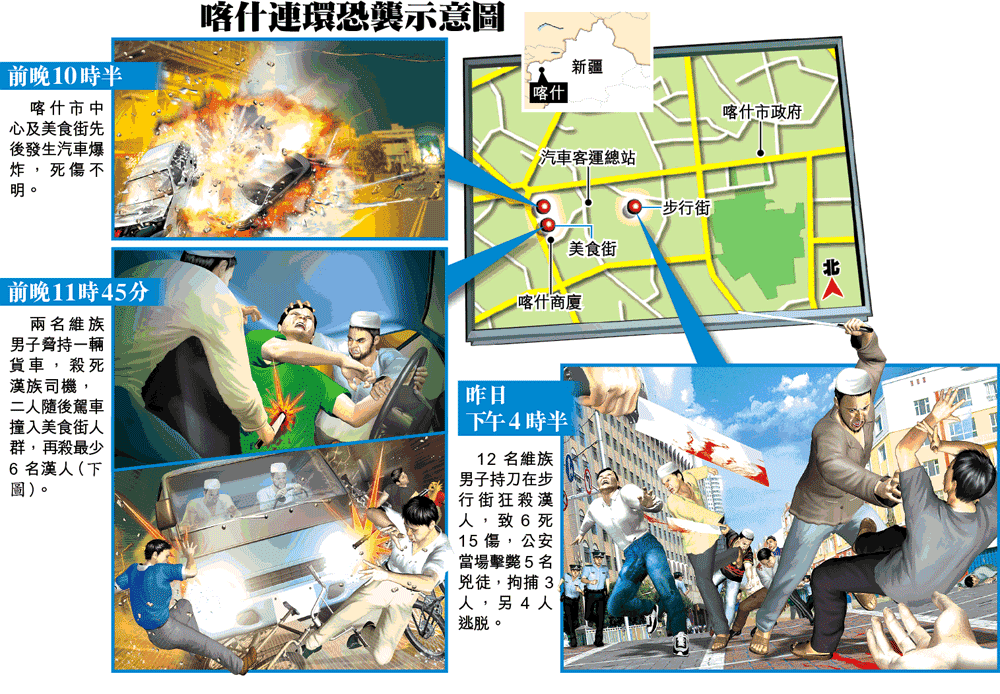 在喀什步行街開店的范春成表示,無論如何都不曾想到,前晚已經發生恐襲的喀什,昨日下午會再次發生斬殺事件。他表示,案發時他正在店內,聽到相鄰的朋友們大叫「又出事了」,他手持木棒跑出店,看見許多人在奔跑,「有漢族,也有維吾爾族」。范春成說,他看到一名受傷的男子一手捂着頭部,一邊打電話一邊奔跑。「聽說歹徒有槍,自己只能躲避到安全的地方。」另一名甘肅某公司派駐到新疆工作的男子稱,剛到喀什不久,就遇到兩次恐襲事件,決定申請回甘肅,「是否回來,需要視情況而定」。喀什人民西路一家酒店的員工昨晚對本報表示,從廣播中得知前晚和昨午的襲擊事件,兇徒是用武器施襲,沒有發生爆炸。當局稱情況已被受控制,沒聽說實施戒嚴。「但現場一帶有很多公安和特警戒備,經過的市民都要檢查身份證。酒店方面已勸喻住客暫時不要外出,員工亦要加強防範。」
