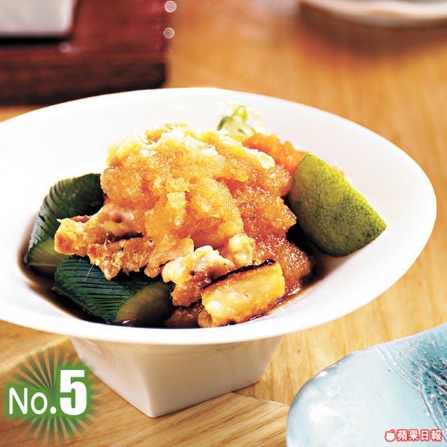 有乜刁鑽位好食?推介串燒雞髀筋,何謂雞髀筋?即雞髀相連雞背脊嗰條筋,每隻雞只得兩條咁大把,所以每日限量供應,賣完就無,師傅話:「切出雞髀筋連埋附近嘅嫩肉做串燒,貪呢個位運動量小,肉質特別嫩滑,雞髀筋又夠煙韌,一串串燒可以嘆齊雙重口感,加上陣陣炭香非常惹味。」計我話,左手一串串燒右手一杯Sake,咁就真係正到痹嘞。食完串燒,喫多個雞髀筋治部煮,用木魚汁煮野菜、茄子等時菜,的的骰骰一口一件,雞肉非常嫩滑,又係要讚。