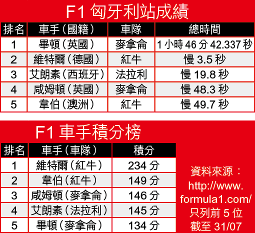 【綜合匈牙利外電】F1匈牙利站周日在忽雨忽晴的天氣下舉行,麥拿侖的英國車手畢頓取得冠軍,以慶祝自己第200次F1賽事,紅牛的維特爾及法拉利的艾朗素,分列2、3名;在第5圈已領先的咸姆頓,則因換輪胎策略出錯,最後僅得第4位,失去在車手榜追近維特爾機會。