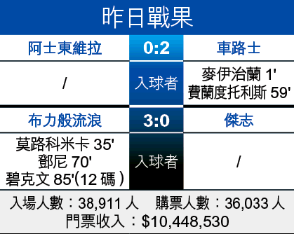 面對同是英超球隊維拉,車路士今仗作出了多個調動,門將由施治把關,伊雲洛域、安歷卡及麥伊治蘭等都任正選,反而費蘭度托利斯(F托)及杜奧巴都退居後備。不過車路士還是發揮較好一隊,無論是中前場的組織力,或者後防線的合作性,都遠勝由麥利殊領軍的維拉。
