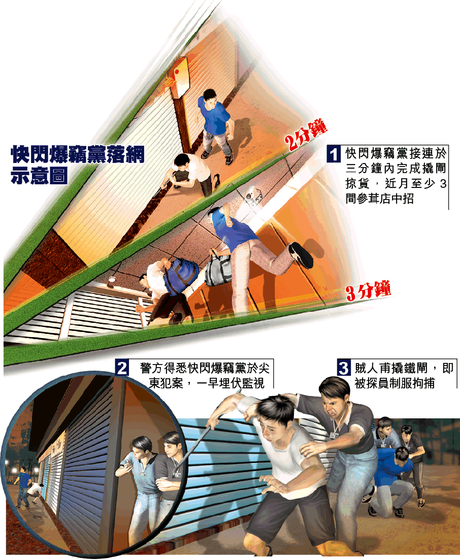 由於近月發生多宗參茸店爆竊案,警方西九龍重案組接手調查,並根據線報知悉一個爆竊集團,準備向尖東該燕窩參茸店落手。警方作出部署在附近一帶埋伏。昨清晨6時,快閃爆竊組的兩名賊人,乘一輛私家車抵達尖東。
