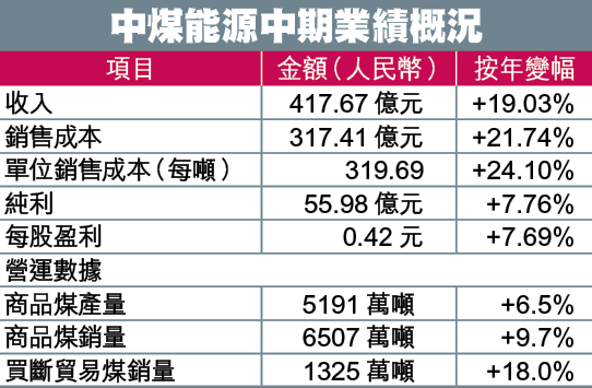 【本報訊】中煤能源(1898)積極提高現貨煤銷售比例的策略終見成效,中期純利升7.76%至55.98億元(人民幣.下同),每股盈利0.42元,優於市場預期。